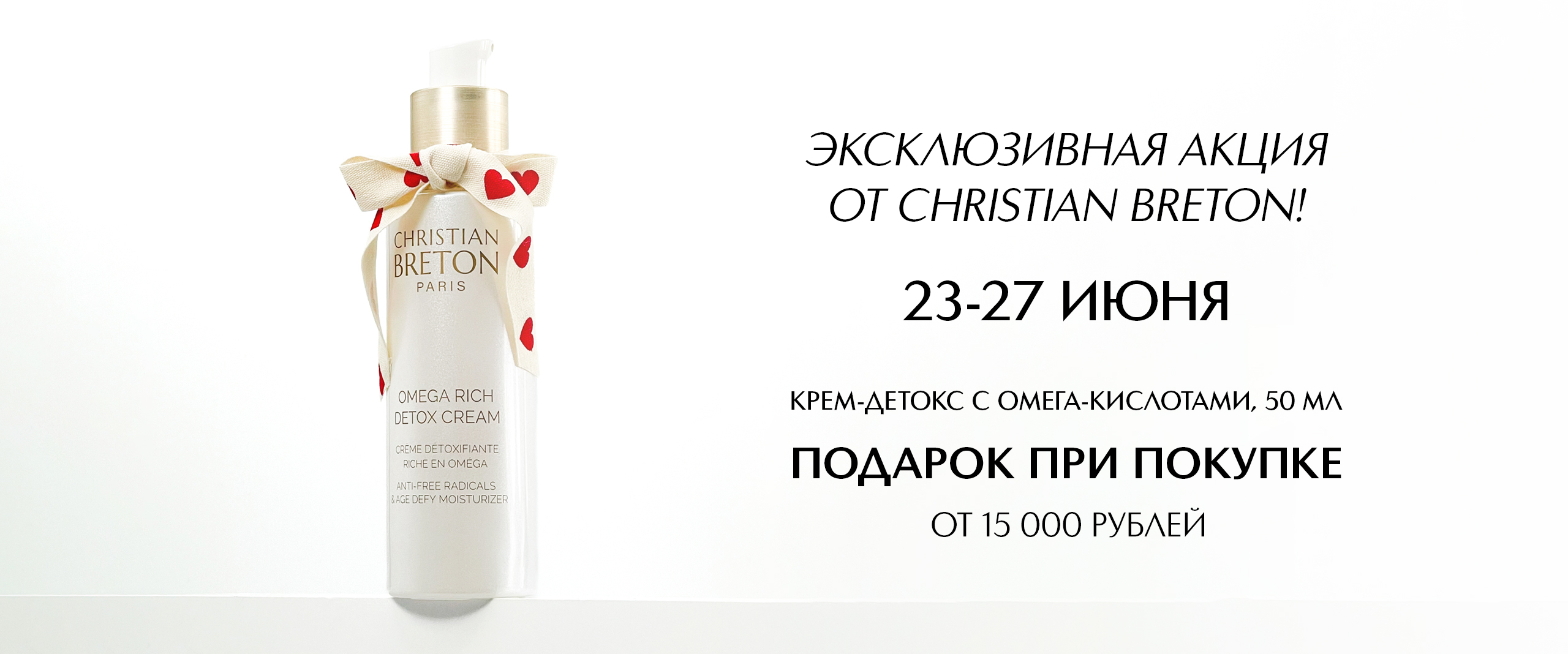 Всё очень просто! Выберите любые товары из нашего ассортимента на сумму от 15 000 рублей, и вы получите свой роскошный крем-детокс в подарок. Это прекрасная возможность пополнить свою коллекцию косметических средств и попробовать новинку от Christian Breton.